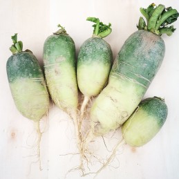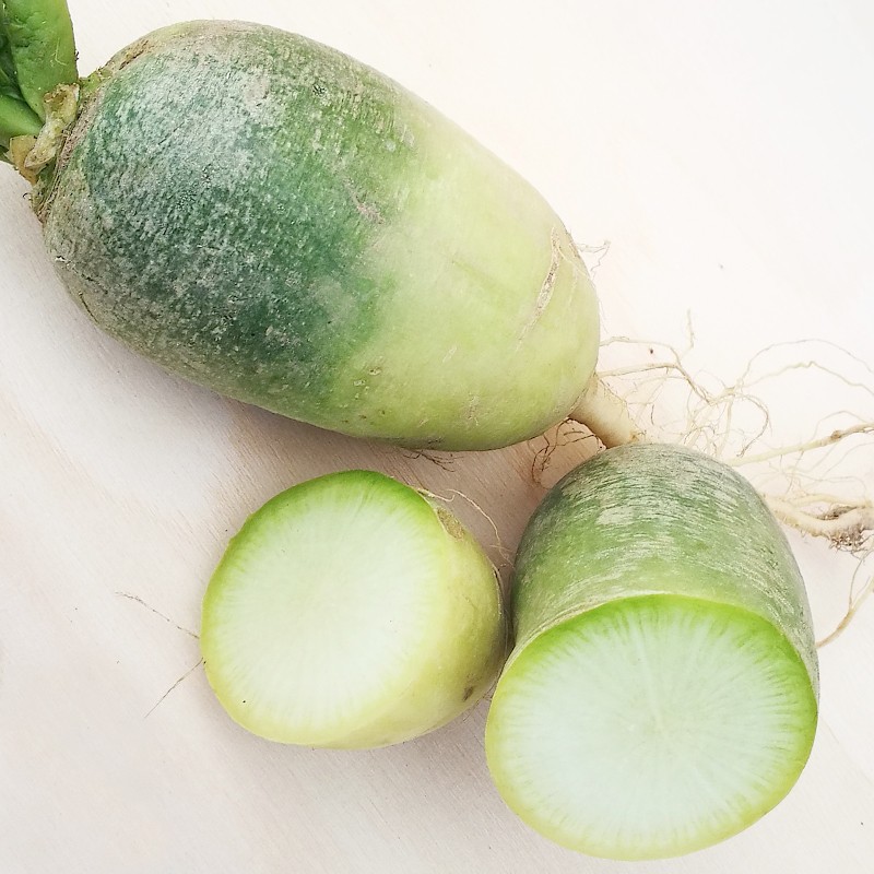 Le "Green Meat", variété de radis d'hiver, plus gros que le radis rose, de forme allongée, sa peau de couleur verte sur la partie supérieure et blanc ou crème sur la partie inférieure, sa chair vert clair est croquante et juteuse, à la saveur fraîche et piquante, plus atténuée que le radis noir.